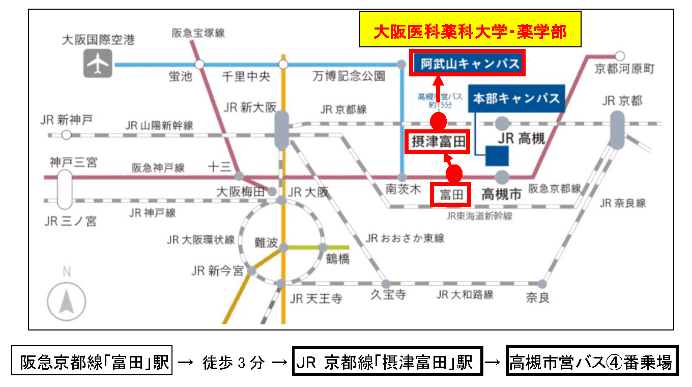JR「摂津富田」駅の高槻市営バス「JR 富田駅」④番乗場から「大阪医科薬科大学(薬学部)」行又は「公団阿武山」行乗車で「大阪医科薬科大学(薬学部)」下車すぐ。所要時間: 約15分